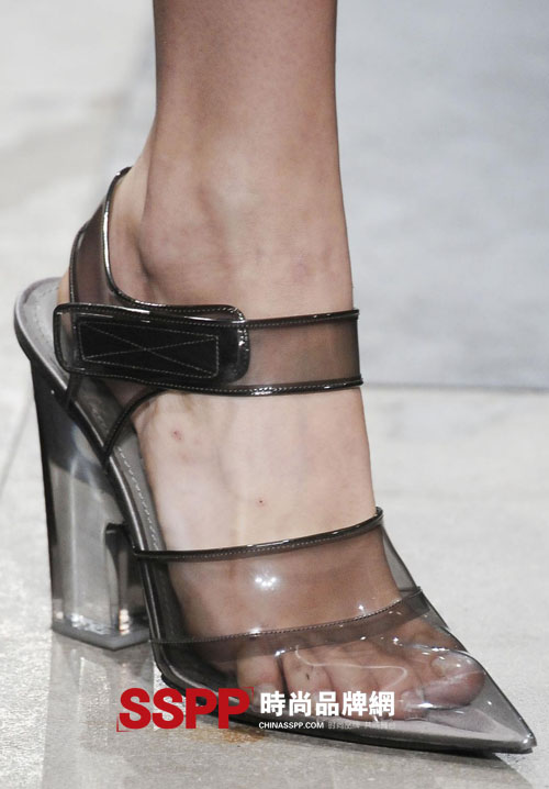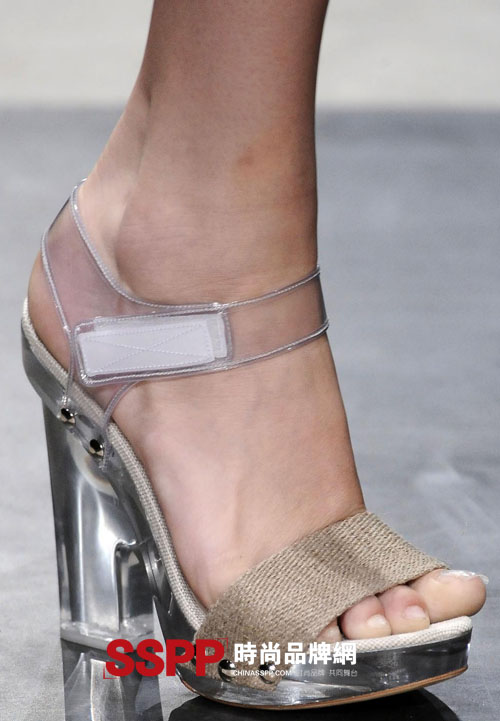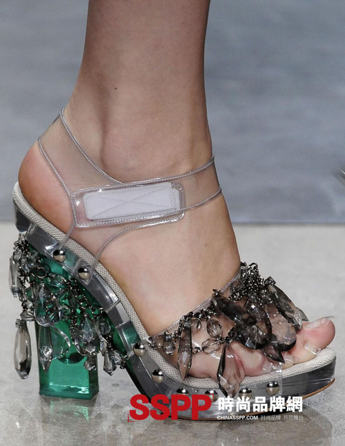普拉達(Prada)2010春季新品給了大家無限驚喜。不僅因為他們的“簾布”透明衣服,更是因為那些塑料高跟涼鞋,奇特、大膽、創意,采用PVC的透明材質,用水晶吊墜作為裝飾,在鞋首綁帶均使用魔術貼|粘扣帶(Velcro)來固定,與優雅矜持的外形對比強烈,卻有不易察覺的隱晦。